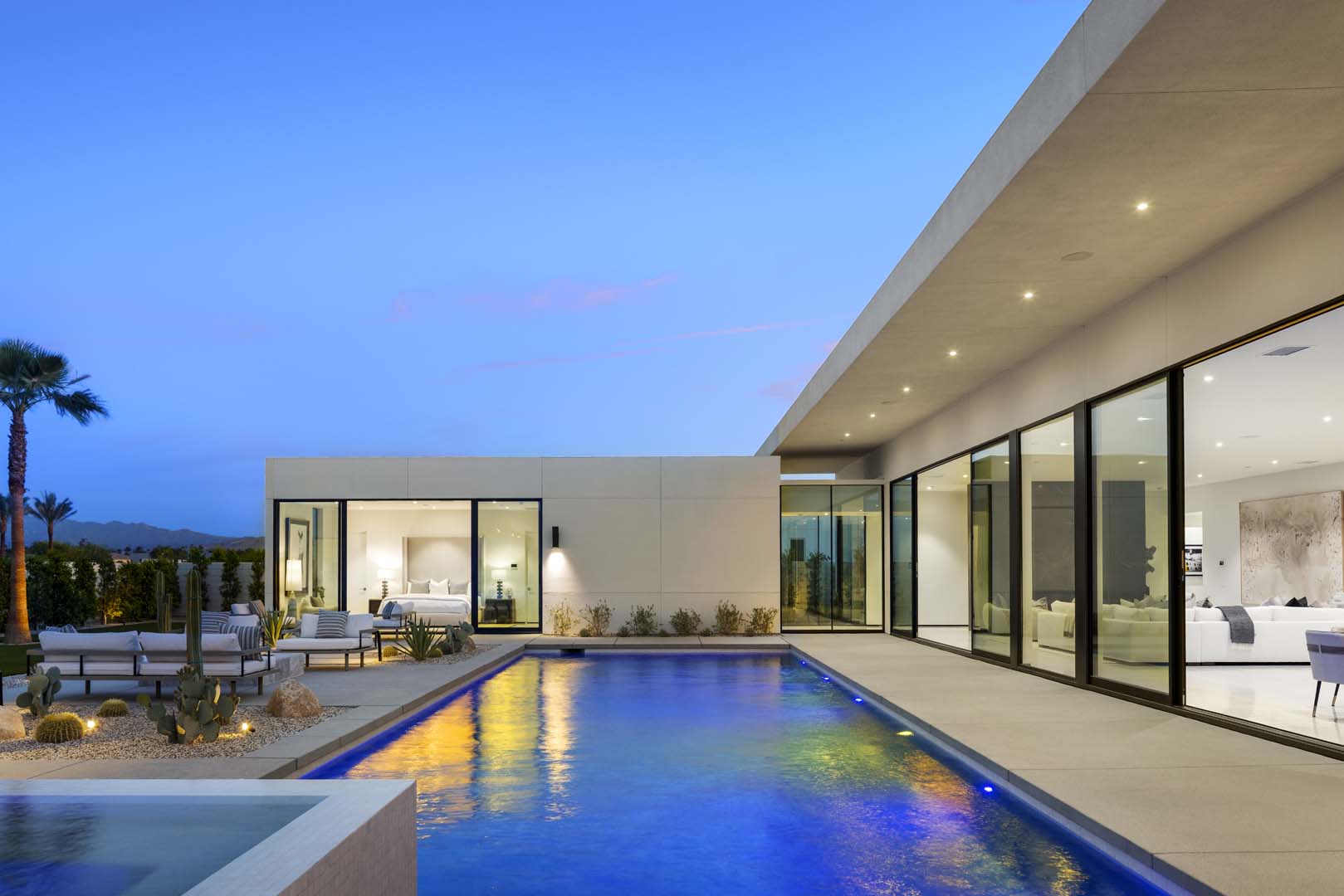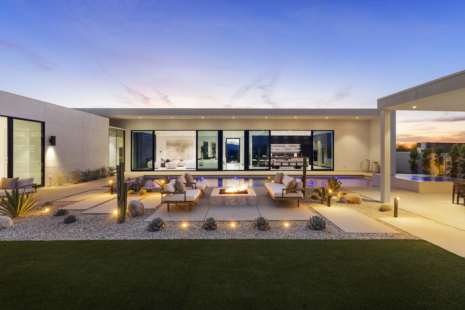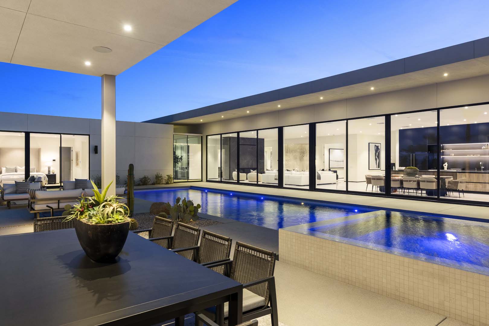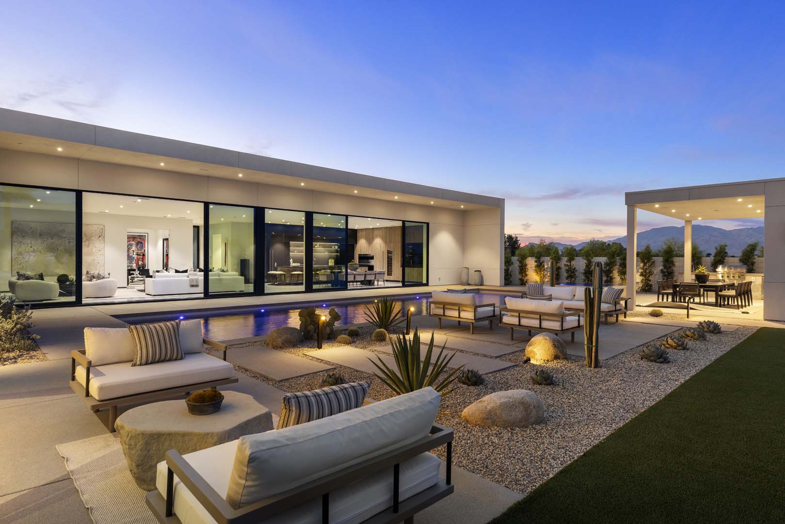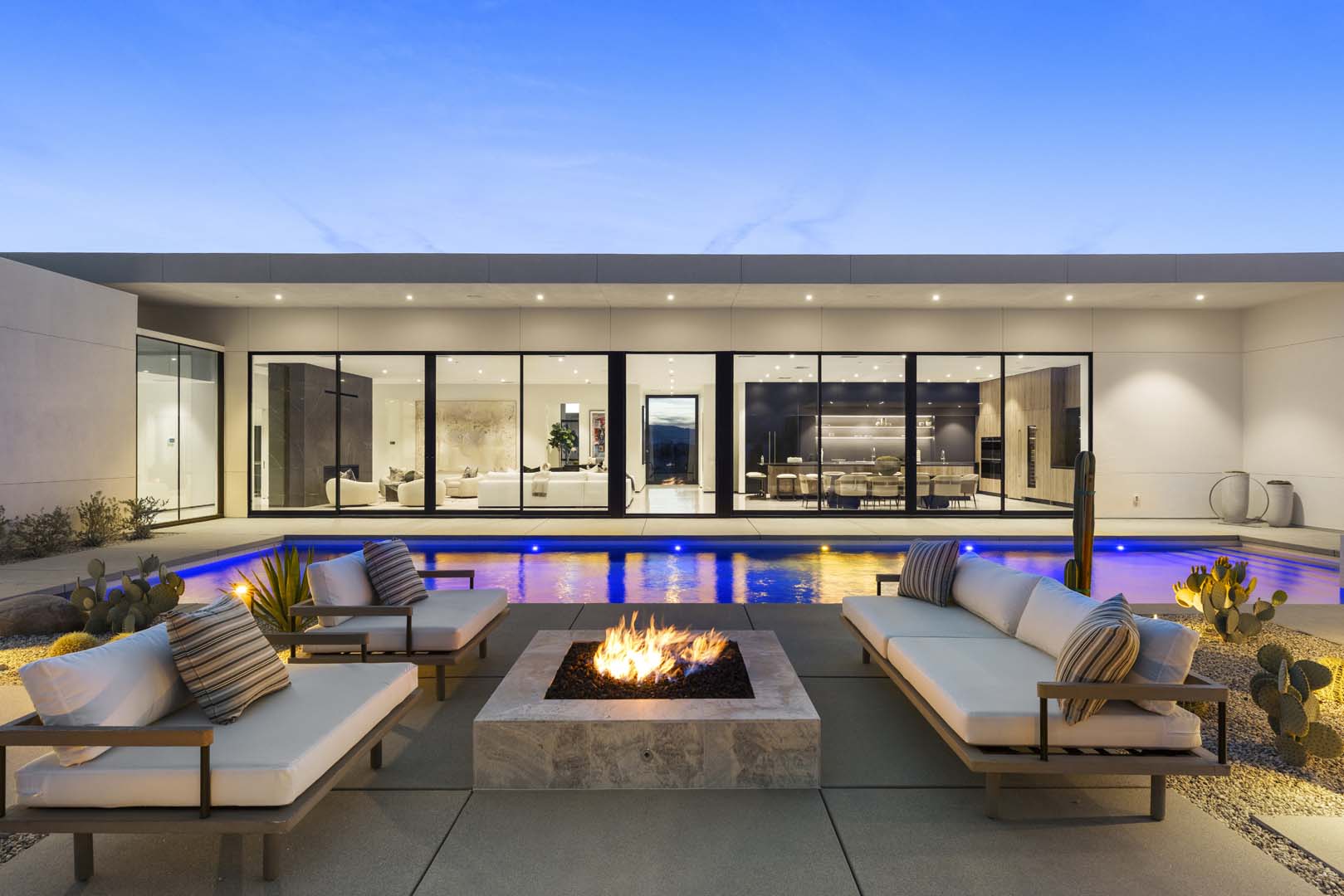 A dramatic modernist estate, Residence Seventeen accentuates scale and light, providing luxurious and expansive open living spaces; all the qualities of a truly grand architectural residence. The home boasts an impressive wall of glass that captures panoramic grand mountain views. The primary suite is attached by a stunning glass corridor connection, an independent pavilion gracefully overlooks a grand resort pool. The site line of the 90-foot long dramatic roof overhang unifies the powerful glass façade and mutes lighting for the media room garden. The breathtaking interior includes a massive free-floating fireplace and stylish Italian floor to ceiling cabinetry with wine column and display. A huge theater/media room with its glass wall to the artfully designed cactus garden are but some of the enlightened architectural features of this stylish home.