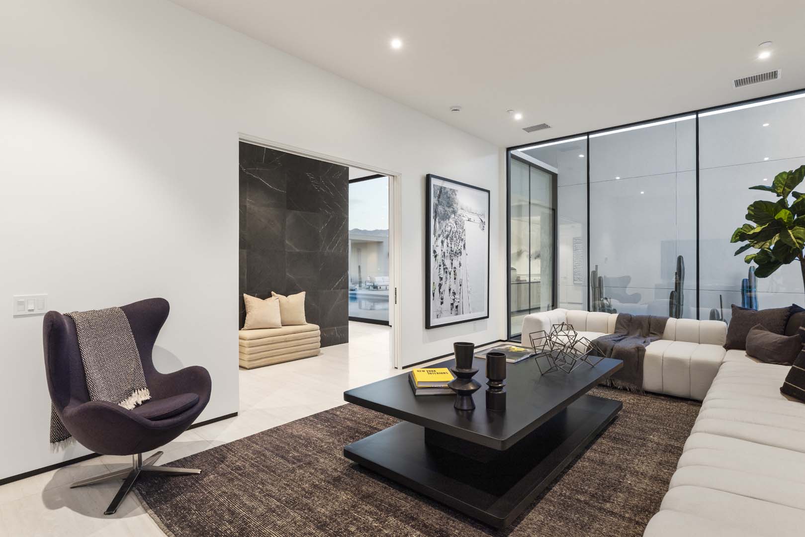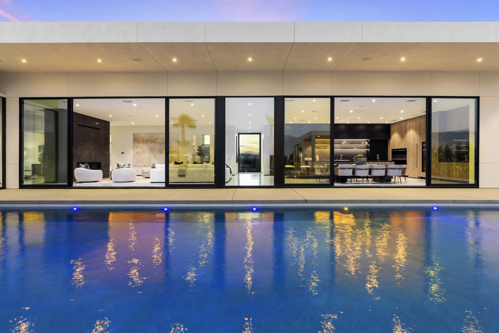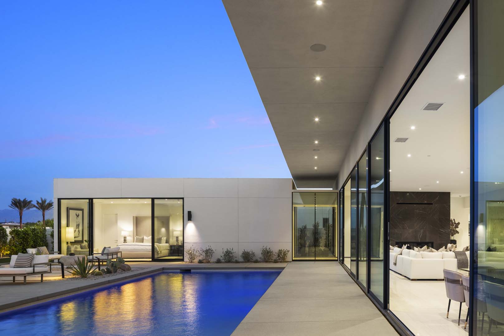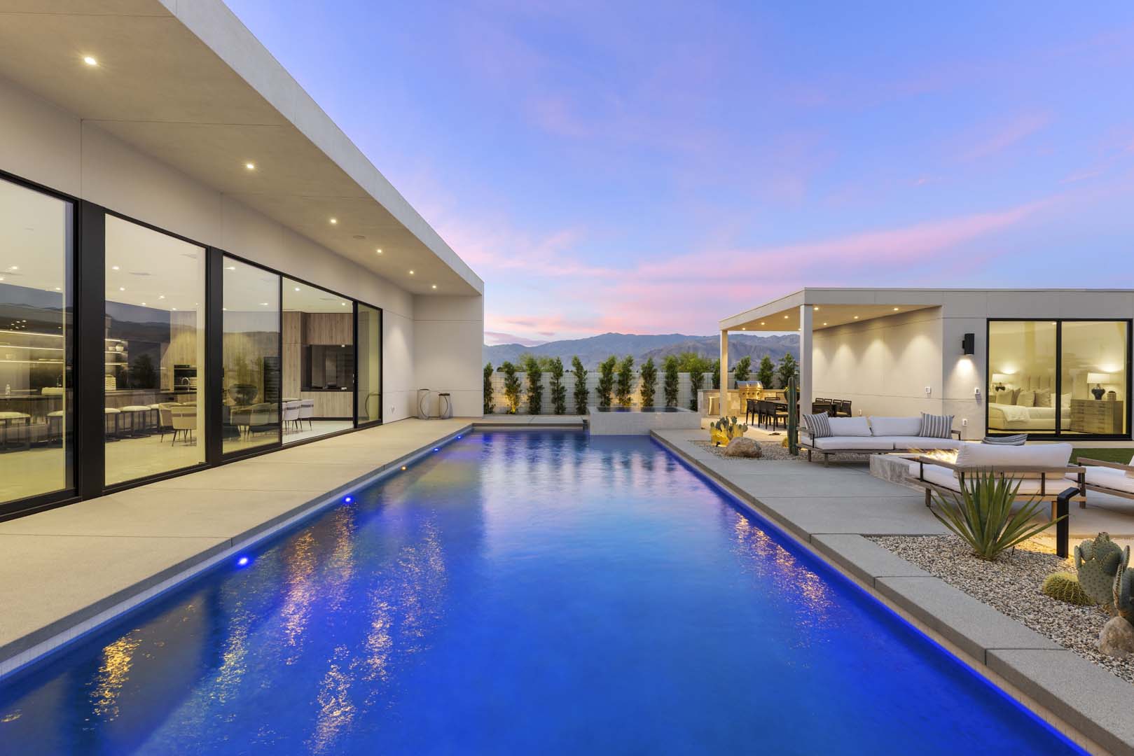 A dramatic modernist estate, Residence Seventeen accentuates scale and light, providing luxurious and expansive open living spaces; all the qualities of a truly grand architectural residence. The home boasts an impressive wall of glass that captures panoramic grand mountain views. The primary suite is attached by a stunning glass corridor connection, an independent pavilion gracefully overlooks a grand resort pool. The site line of the 90-foot long dramatic roof overhang unifies the powerful glass façade and mutes lighting for the media room garden. The breathtaking interior includes a massive free-floating fireplace and stylish Italian floor to ceiling cabinetry with wine column and display. A huge theater/media room with its glass wall to the artfully designed cactus garden are but some of the enlightened architectural features of this stylish home.